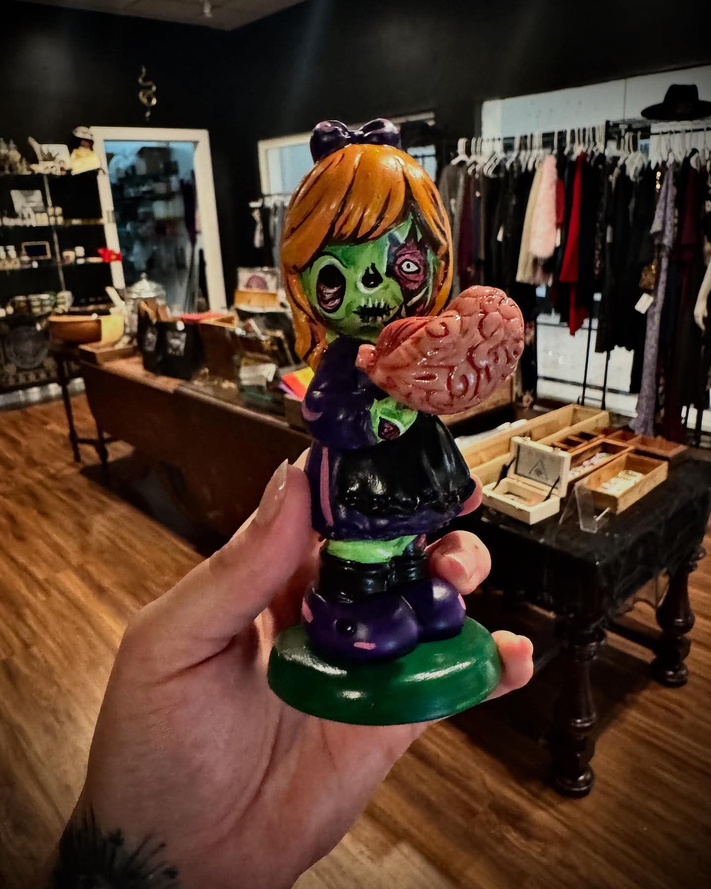 This reanimated sweetheart was once a wide-eyed cherub of sentimentality—now she’s a fully actualized zombie child clutching a brain like it’s a Build-A-Bear heart. Hand-painted in ashen tones with vacant, soulful eyes, she’s here to serve up a snack and question the fragile boundaries between life, love, and gray matter.