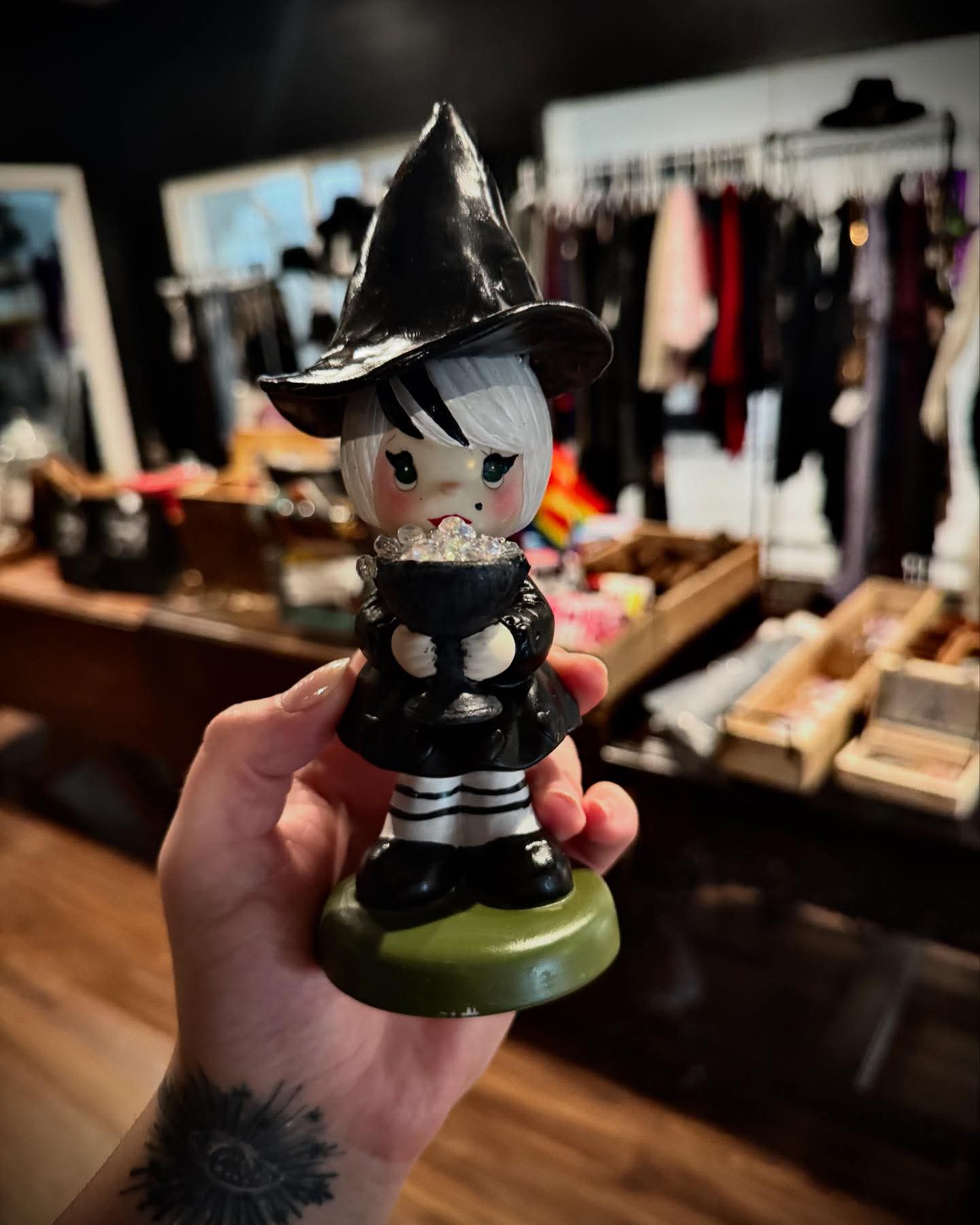 This spooky cutie is a hand-altered precious doll turned tiny, powerful witch, complete with a mini cauldron overflowing with shiny nonsense, spells, and probable curses. Her sweet expression masks unmeasurable power—and possibly a few secrets. She’s here to hex gently, stir dramatically, and protect your crystals like they’re her tiny glittering children.