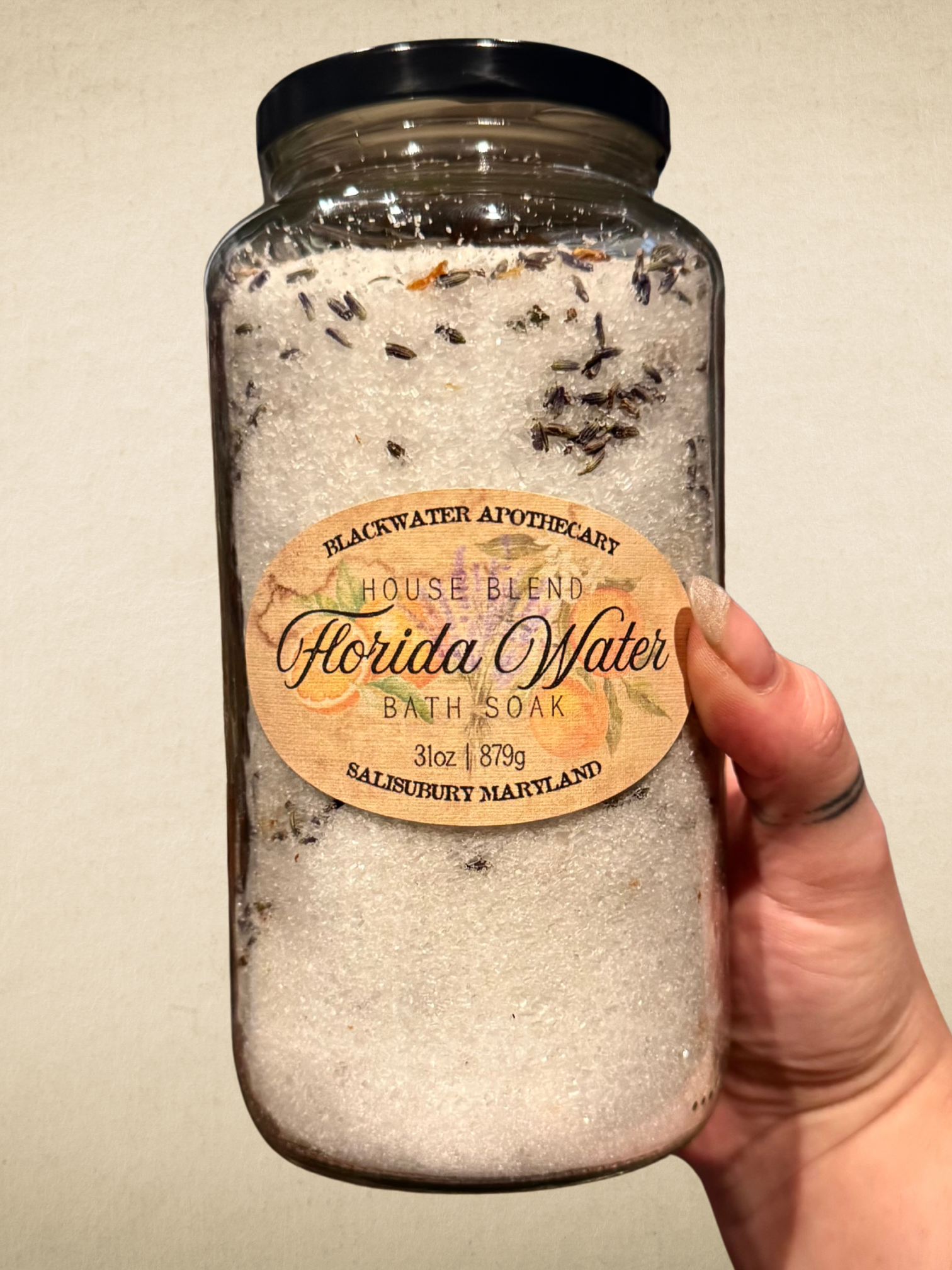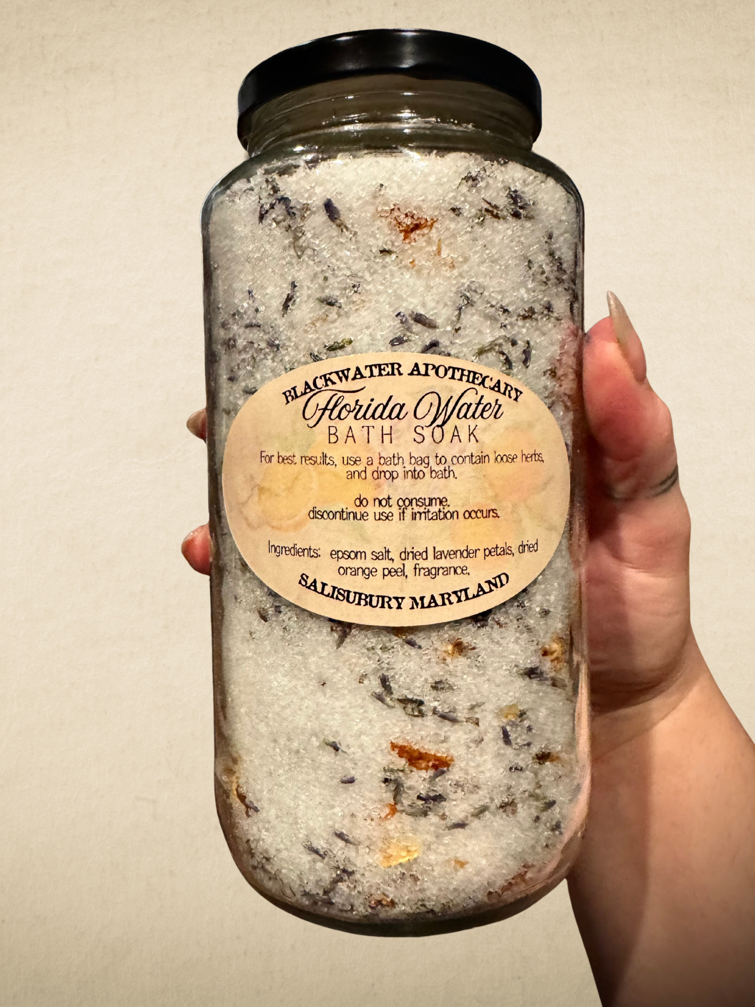Inspired by the traditional Florida Water cherished in spiritual practices across the Americas, our Florida Water Bath Soak is crafted with care and intention right here at Blackwater Apothecary. This large 31oz glass jar is filled with a soothing blend of epsom salt, dried lavender, dried orange peel, and our signature fragrance. Together, they create a bath ritual that is both physically restorative and spiritually clarifying.
