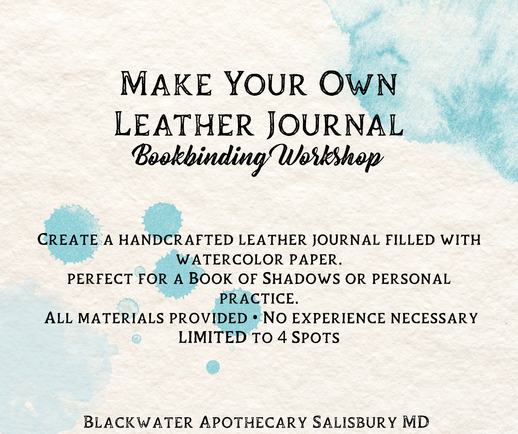 Craft a one-of-a-kind leather journal in this hands-on bookbinding workshop led by Shayne. You’ll create a substantial leather-bound journal (approximately 8” H × 5” W × 2” D) filled with beautiful watercolor paper—perfect for a Book of Shadows, spellwork notes, art, or sacred journaling.