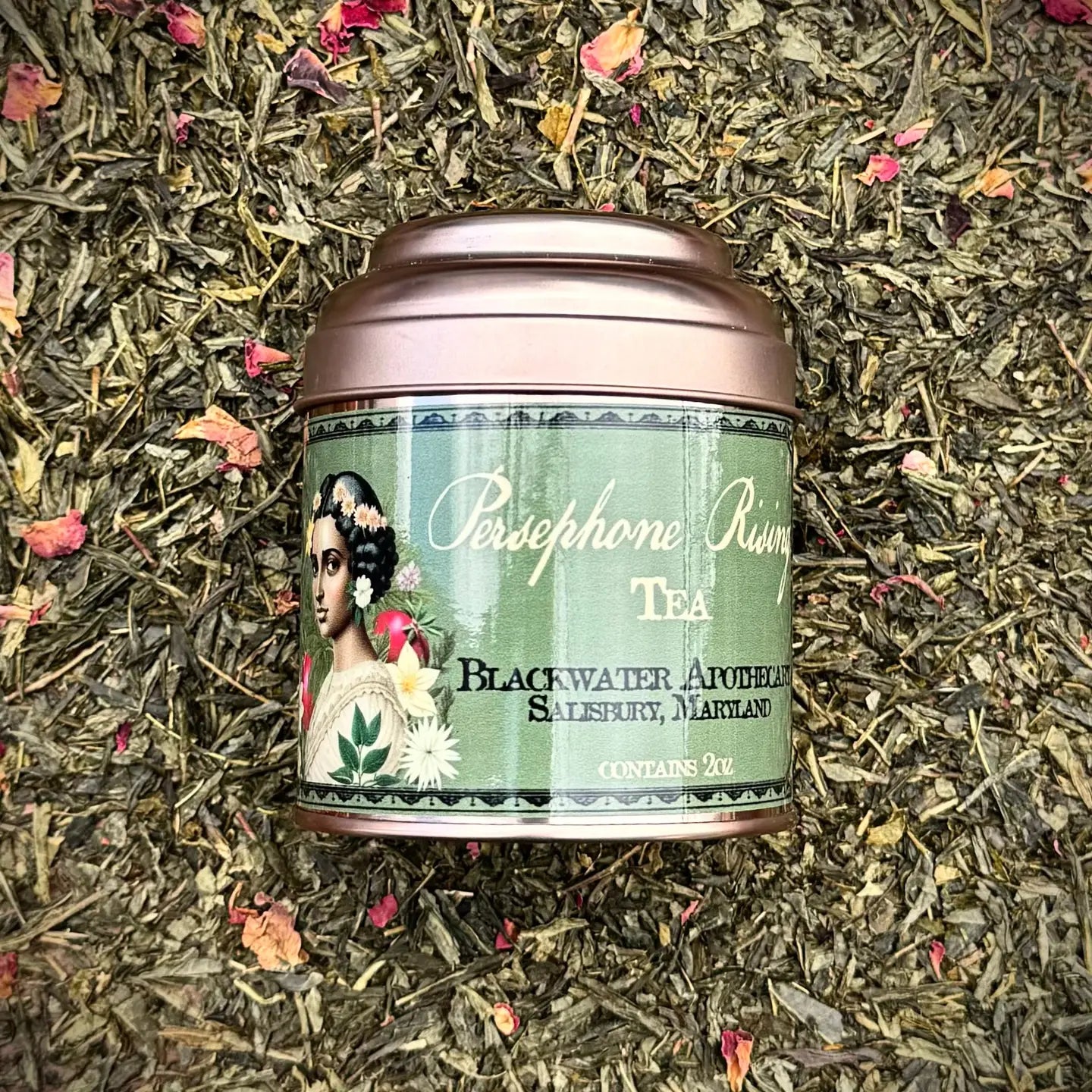 Persephone Rising is a celestial blend of Green Tea Leaf with ethereal Rose Petals and luscious Pomegranate, inspired by Persephone, the Greek Goddess of spring and queen of the underworld.